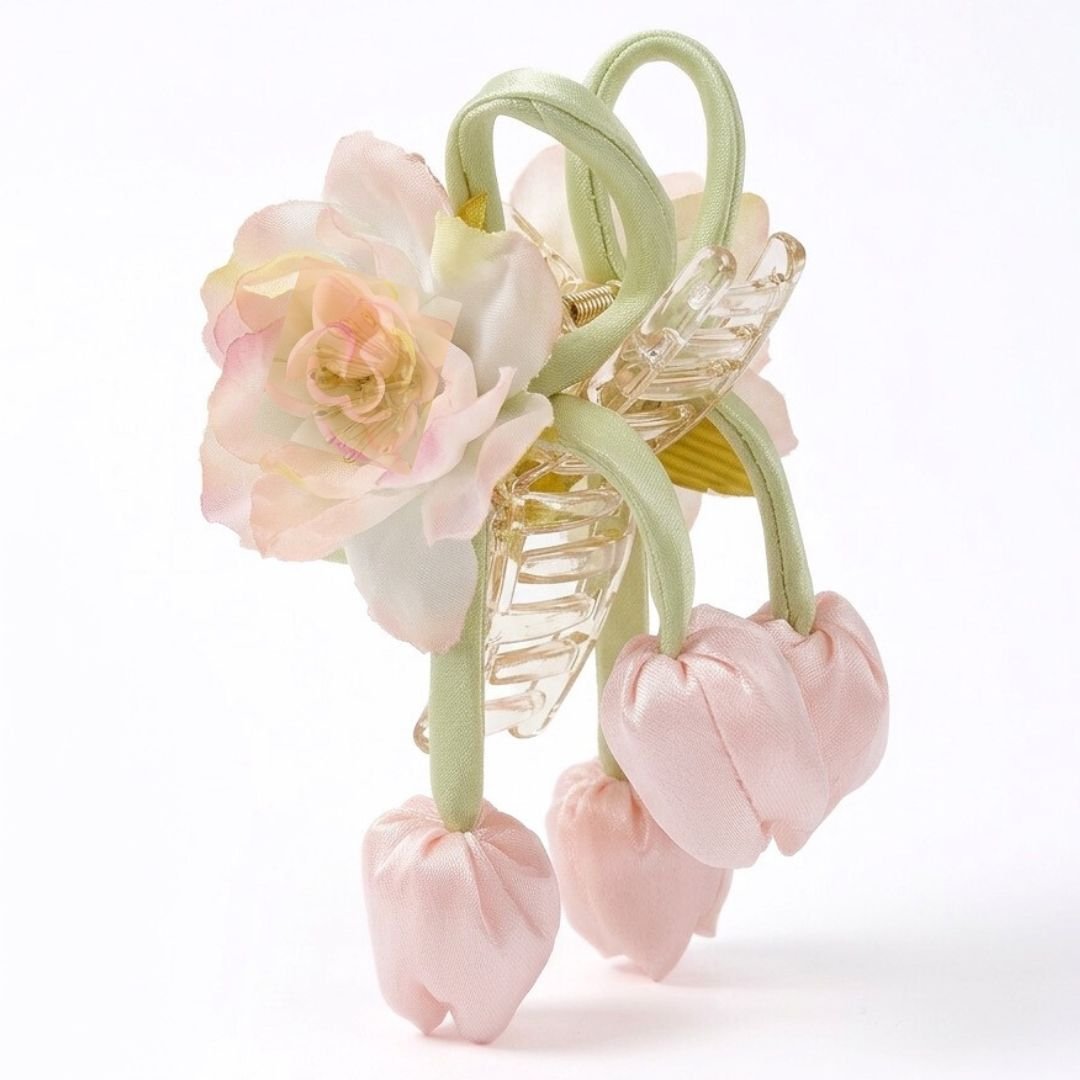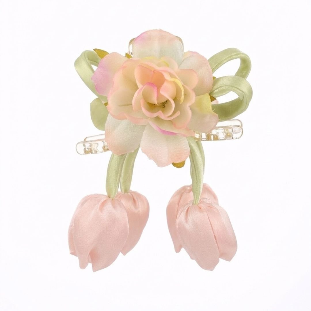 Elevate your hairstyle with the Floral Satin Hair Claw Clutcher in a delicate pink hue. Featuring charming tulip-shaped drops and a smooth satin finish, this accessory is perfect for adding a touch of sophistication to your look.