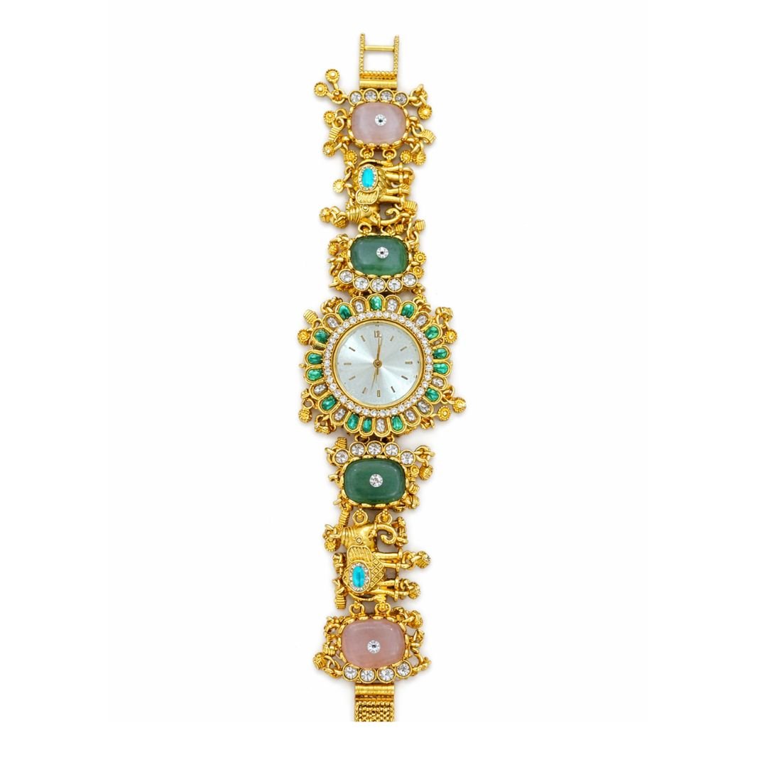 Elevate your accessory game with the Heritage Jewelry Golden Watch, meticulously crafted to combine sophistication and charm. Its unique pink and mint green accents beautifully contrast against the golden frame, making it a standout piece for any occasion.