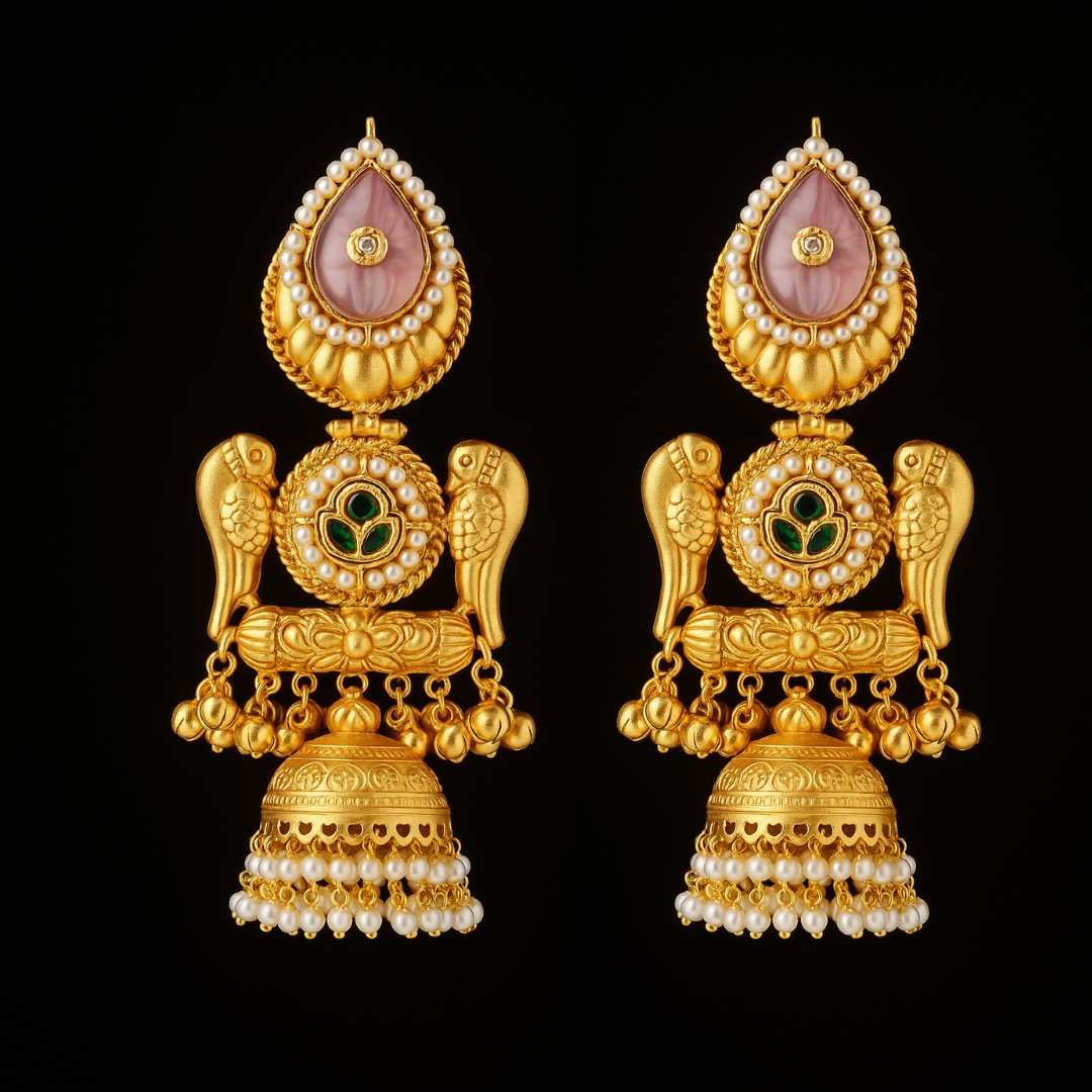 Parrot Motif Gold Jhumka Earrings