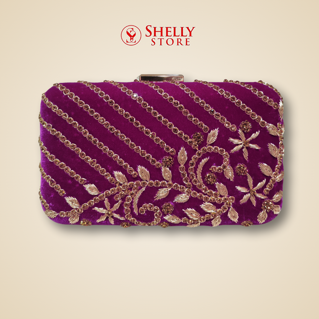 Purple Velvet Bridal Clutch with Diagonal Beadwork Embroidery
