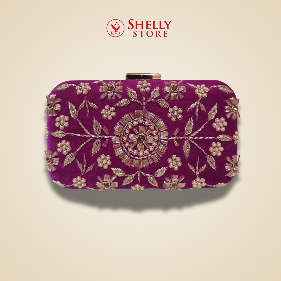 Purple Velvet Bridal Clutch with Gold Floral Embroidery