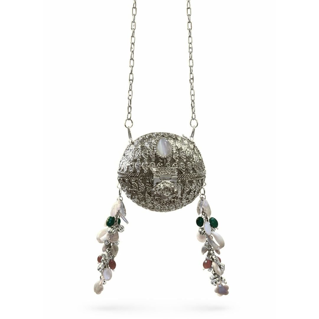 Whether you’re attending a wedding, celebration, or festive event, the Round Antique Silver Batua Clutch complements any attire seamlessly. Its compact design ensures maximum convenience while maintaining elegance.